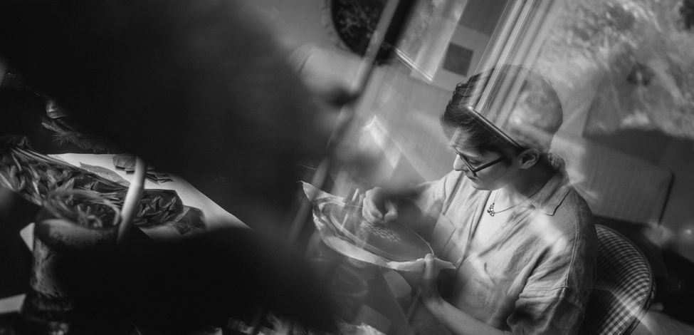 Brandibas re-invents needlepoint embroidery as an expressive and poetic medium, developing a range of delicate techniques: from her painterly use of dying fabrics, through to the creative fine needlework of the embroidery itself.