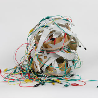 By using materials such as antenna cable, typewriters and VHS tapes, Mounir Fatmi elaborates an experimental archeology that questions the world and the role of the artist in a society in crisis. He twists its codes and precepts through the prism of a trinity comprising Language, Architecture and Machine. Thus, he questions the limits of language and communication while reflecting upon these obsolescent materials and their uncertain future.